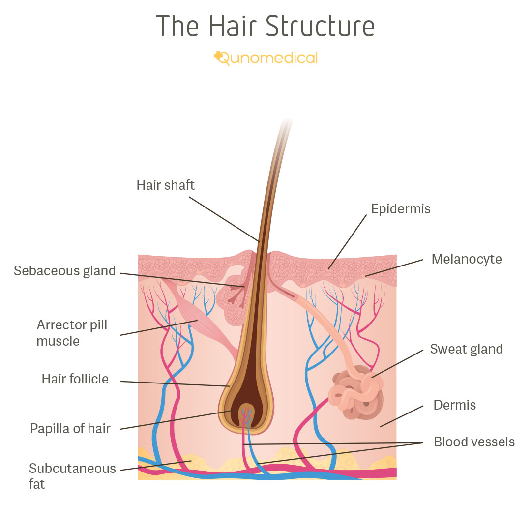 The blue and red lines you see attached to the hair papilla³ are the blood vessels that carry the blood, nutrients, and oxygen to the hair. The papilla uses that energy to regulate the hair follicle’s development and growth. It’s also thought that the papilla contains a reserve of stem cells.
