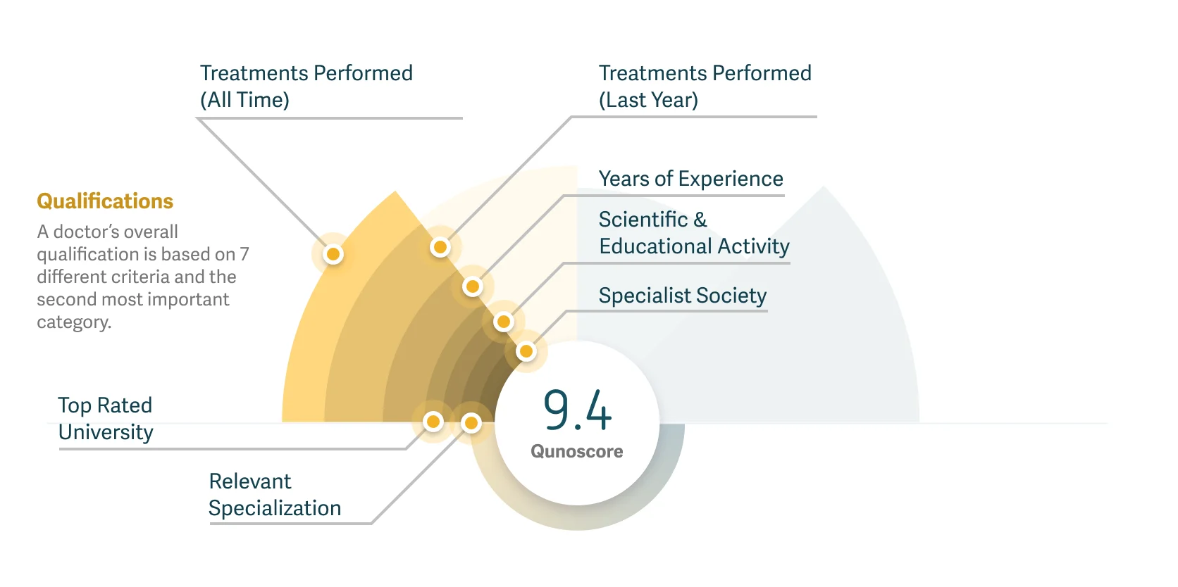 We aim for complete transparency in everything we do. On our doctor profile pages, for example, you can see a detailed breakdown of the Qunoscore for that specific doctor and how it was calculated based on the individual factors. This allows you to choose a doctor based on the criteria that matter most to you, with a scoring system that is transparent and upfront.